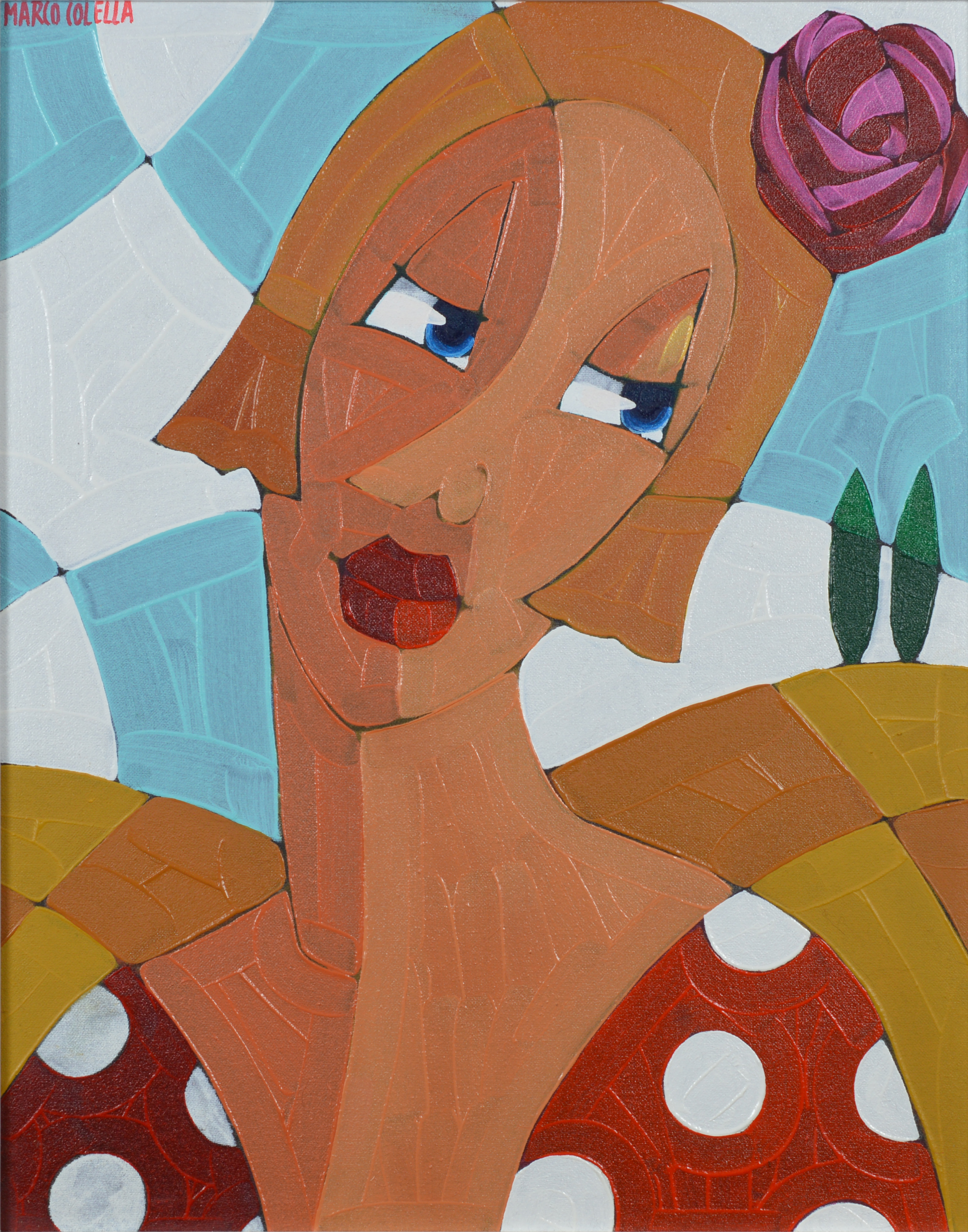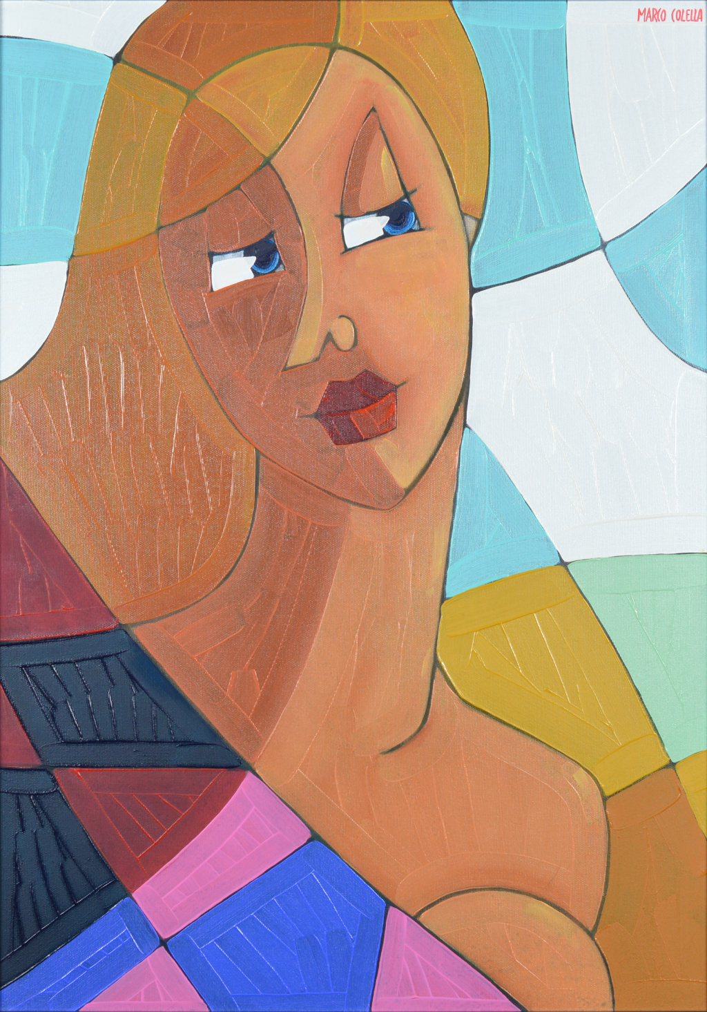 Colore luce linea sono gli elementi su cui Marco Colella fonda la sua sigla pittorica attraverso la quale ritrae – con spirito ludico quanto critico – un’umanità viva e festante che vede protagonista le tante sfaccettature del femminile (dalla timidezza all’esaltazione della bellezza) o della coppia maschile-femminile.